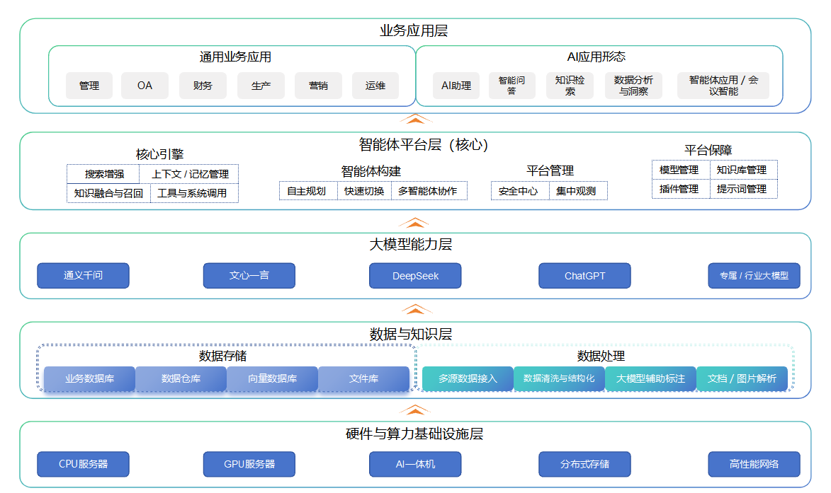 以智能体平台为核心,将大模型能力工程化、平台化,统一支撑 AI 助理、智能问答、数据分析与业务智能体应用,显著降低 AI 应用开发与落地门槛,实现从“模型能力”到“业务价值”的快速转化。